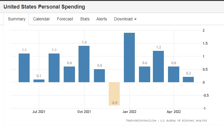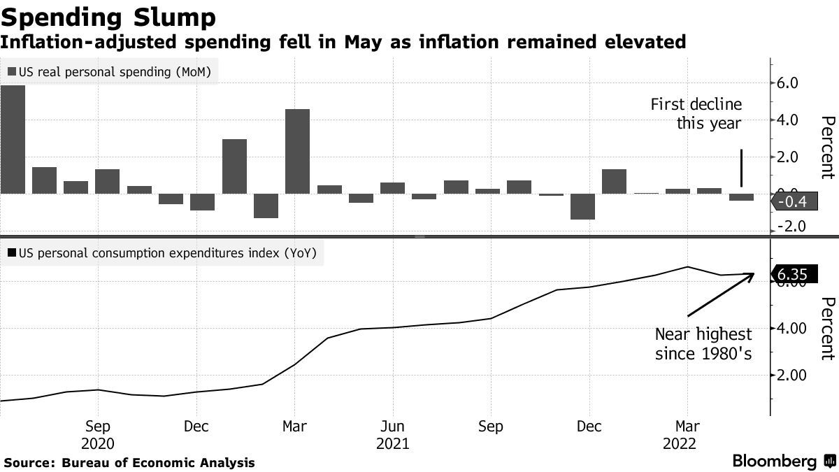 智通财经APP获悉,美国商务部周四公布的最新数据显示,5月份经价格调整的商品和服务支出水平(实际个人消费支出)下修至环比下降0.4%,一个月前该项数据(4月数据)向下修正后为小幅增长0.3%。数据显示,服务支出在上升,而商品支出急剧下降。最新通胀数据方面,美国5月个人消费支出价格指数(PCE物价指数)较上月上涨0.6%,市场预期为0.7%;较2021年5月上涨6.3%,市场预期为6.4%。