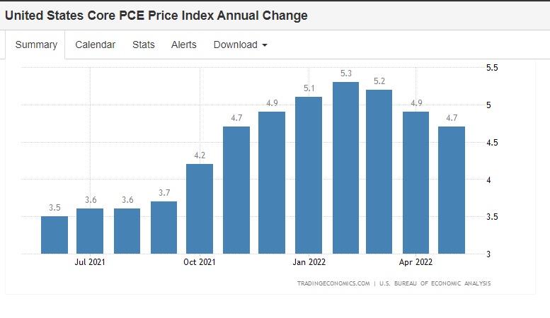 数据显示,美联储最爱的衡量通胀的指标——核心PCE价格指数环比上涨0.3%,同样低于市场预期(0.4%)。该指数较上年同期上涨4.7%,为自去年11月以来的最小涨幅。5月份的数据似乎表明,同比标准下的核心PCE指数没有进一步恶化,并且连续几个月以来呈乐观趋势。