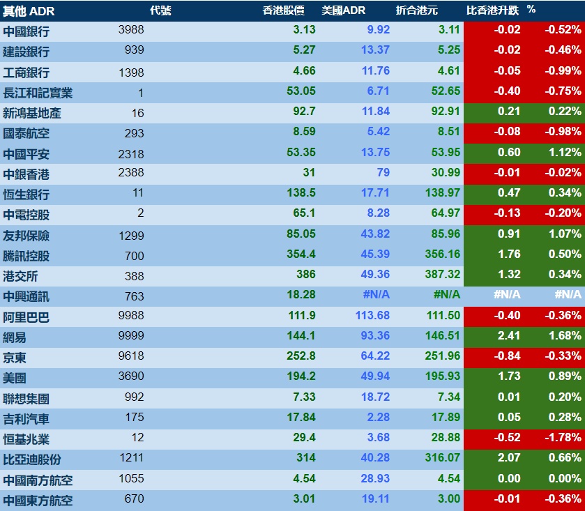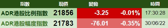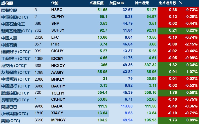 智通财经APP获悉,周四美股三大指数悉数下跌,港股ADR指数下跌,按比例计算,收报21856点,较香港收市跌3.25点或0.01%。