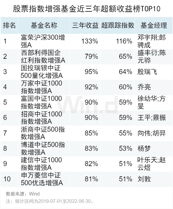 股票指数增强型基金仍保持较高超额收益,其中富荣沪深300增强A以显著优势占据第一,近三年收益为130%,超越跟踪指数113个百分点。