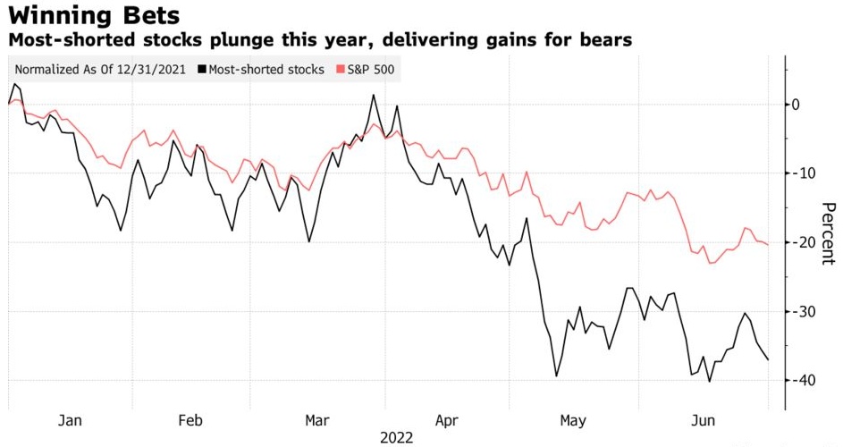 智通财经获悉,随着标普500指数在上半年累计下跌了约20%,那些押注于股市将下跌的投资者的篮子的跌幅也更大。例如,高盛旗下一个被做空最多股票指数下跌了37%,这表明看跌者在搜寻受股市下跌影响最大的公司方面做得特别好。