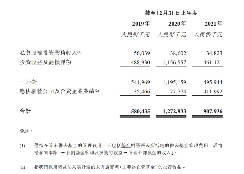 公司分别于2019年、2020年及2021年确认私募股权投资业务收入及收益人民币580.4百万元、人民币1272.9百万元及人民币907.9百万元。