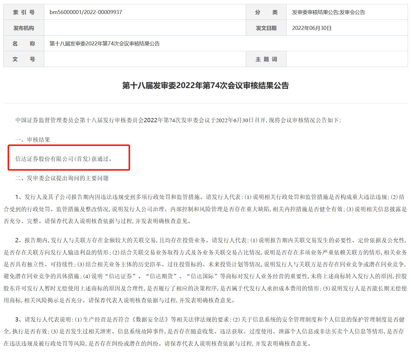 智通财经APP获悉,6月30日,证监会第十八届发行审核委员会2022年第74次发审委会议审核结果显示,信达证券股份有限公司(信达证券)首发获通过。