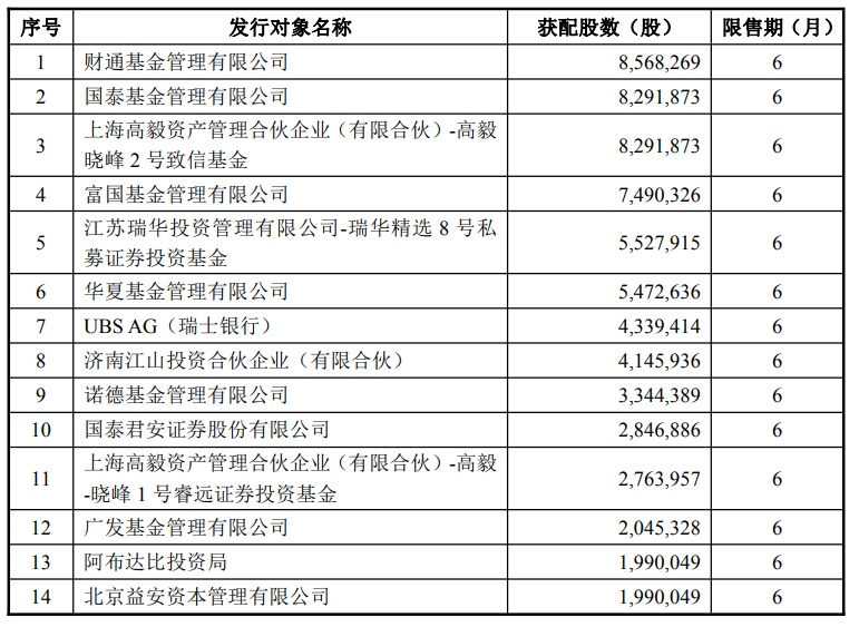 智通财经APP获悉,7月1日,杰瑞股份(002353.SZ)发布非公开发行A股股票之发行情况报告书,确定发行价格为36.18元/股,对应认购数量为6909.8949万股,认购金额约25亿元。据报告书,财通基金、国泰基金、上海高毅资产、富国基金等15家机构参投,限售期均为6个月。