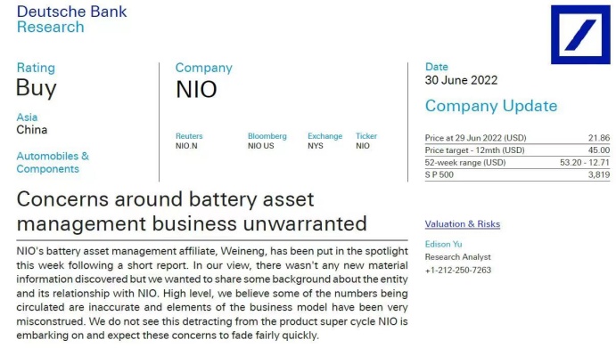 针对此份报告,Deutsche Bank(德意志银行)出具研究报告表示,灰熊对蔚来电池资产管理业务的担忧毫无根据。