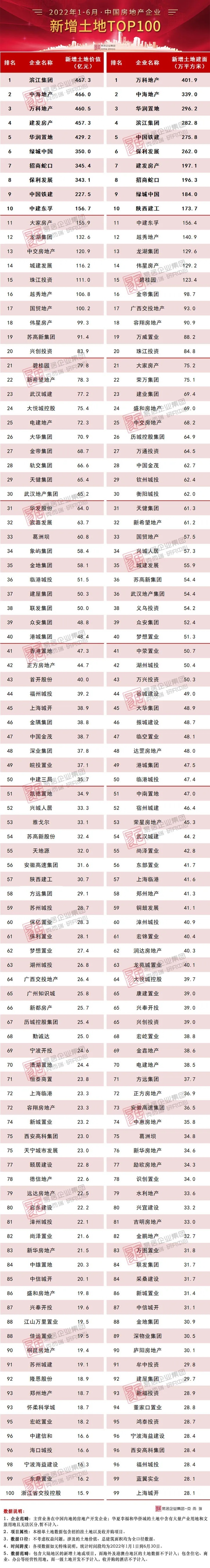 2022年上半年房企投资的力度、投资意愿显著下滑,延续了去年下半年以来投资谨慎的策略。截止6月末,新增货值百强门槛达到44.4亿元,环比上涨41%,但同比大降58%;投资金额、建面百强门槛分别为15.9亿和28.1万平方米,同比降幅为61%。