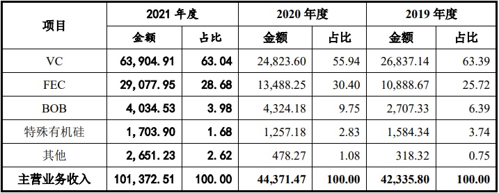 公司主要产品为以碳酸亚乙烯酯(VC)、氟代碳酸乙烯酯(FEC)和双草酸硼酸锂(BOB)为代表的电解液添加剂。在技术创新方面,公司在锂电池电解液添加剂和特殊有机硅领域拥有多项核心技术,包括主要产品的合成、纯化结晶、抑制变色技术等,反应合成效率高,得到的产品杂质少、纯度高、质量稳定,保证全球可靠交付。报告期内,公司主营业务收入情况构成如下: