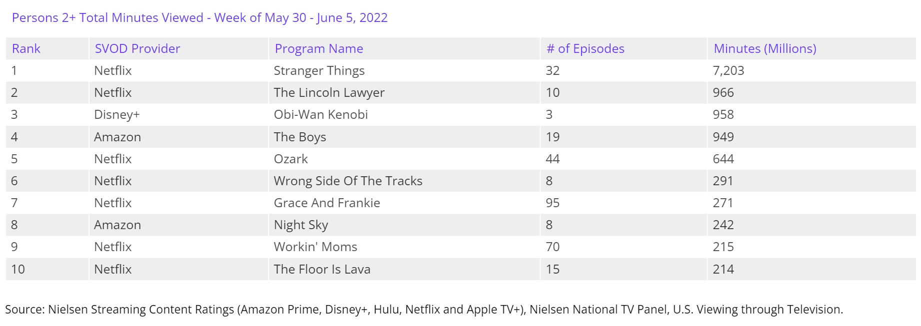 截至6月5日当周,尼尔森统计的累计观看时长前十的剧集中有7部是奈飞的,除了《怪奇物语》第4季和《林肯律师》,剩下的分别是《黑钱胜地》、《Wrong Side Of The Tracks》、《Grace And Frankie》、《Workin' Moms》和《The Floor Is Lava》。