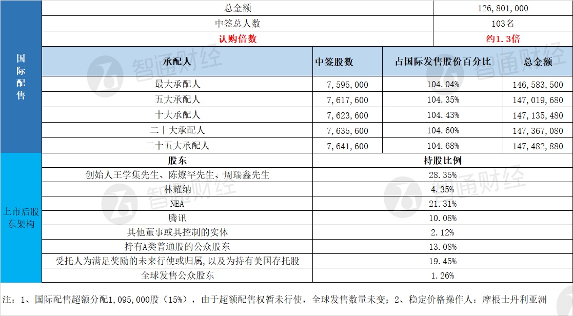 国际配售申购人数未披露,认购倍数约1.3倍。