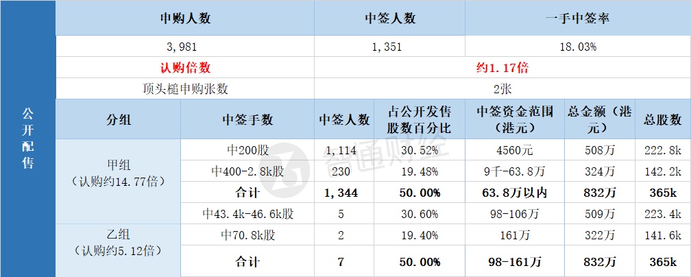 其中,公开配售申购人数3981人,一手中签率18.03%,认购倍数约1.17倍。