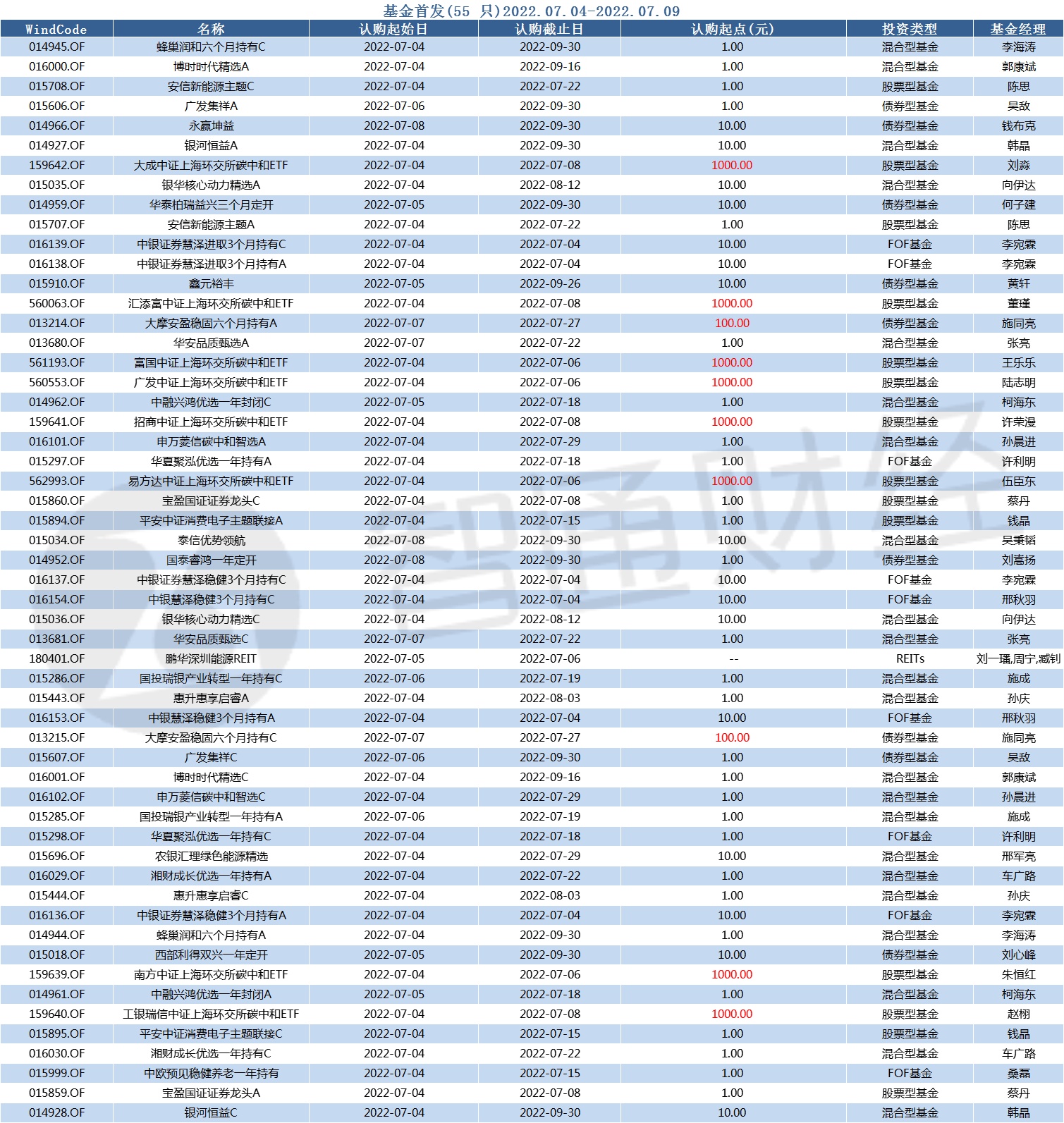 值得注意的是,大成中证上海环交所碳中和ETF、汇添富中证上海环交所碳中和ETF、富国中证上海环交所碳中和ETF、广发中证上海环交所碳中和ETF、招商中证上海环交所碳中和ETF、易方达中证上海环交所碳中和ETF、南方中证上海环交所碳中和ETF、工银瑞信中证上海环交所碳中和ETF等八只碳中和ETF的认购起点均为1000元。大摩安盈稳固六个月持有A、大摩安盈稳固六个月持有C的认购起点均为100元。