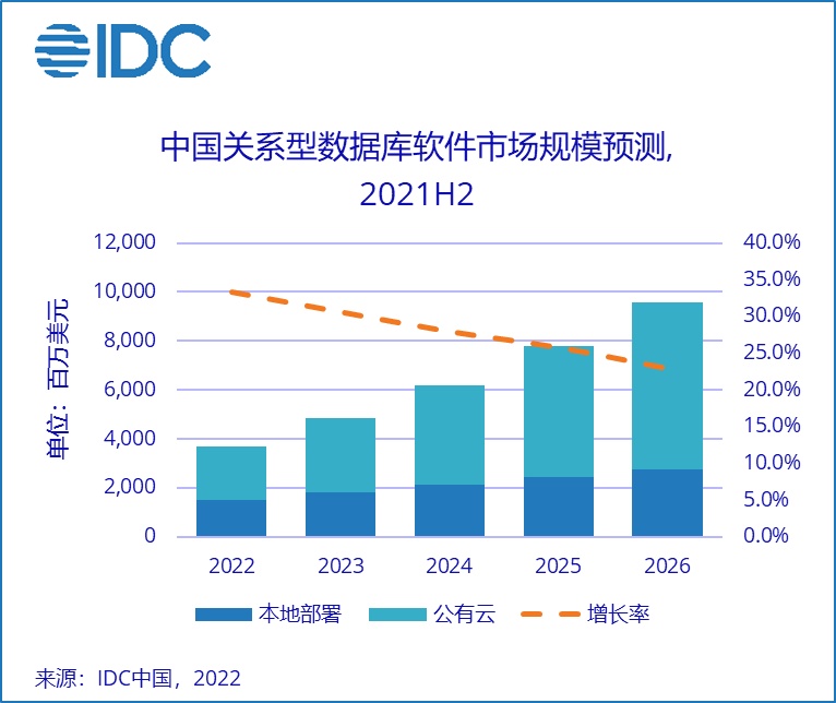 智通财经APP获悉,7月4日,根据IDC《2021年下半年中国关系型数据库软件市场跟踪报告》显示,2021下半年中国关系型数据库软件市场规模为15.8亿美元,同比增长34.9%。其中,公有云关系型数据库规模8.7亿美元,同比增长48.7%;本地部署关系型数据库规模7.1亿美元,同比增长21.1%。IDC预测, 到2026年,中国关系型数据库软件市场规模将达到95.5亿美元,未来5年市场年复合增长率(CAGR)为28.1%。