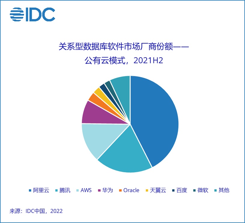 公有云关系型数据库市场的格局比中国公有云总体市场的集中度更高,前五名厂商占据了86.3%的市场份额。