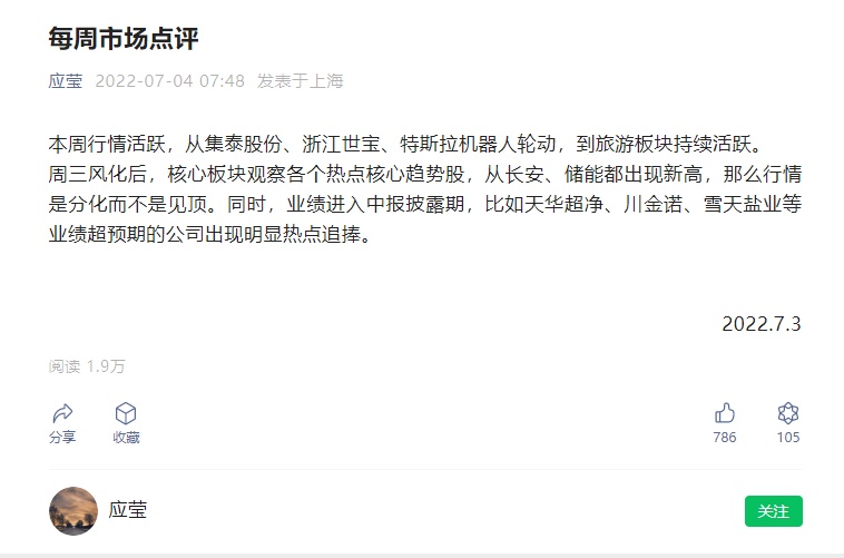 在近日发表的文章中,应莹用130个字对上周市场的热点及板块进行评述。其中指出,”本周行情活跃,从集泰股份、浙江世宝、特斯拉机器人轮动,到旅游板块持续活跃。周三风化后,核心板块观察各个热点核心趋势股,从长安、储能都出现新高,那么行情是分化而不是见顶。同时,业绩进入中报披露期,比如天华超净、川金诺、雪天盐业等业绩超预期的公司出现明显热点追捧“。