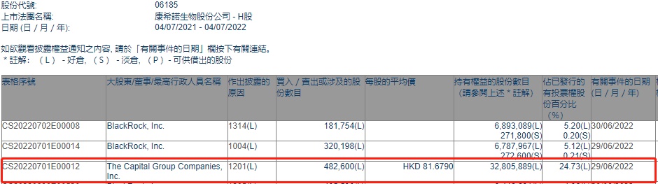 智通财经APP获悉,香港联交所最新资料显示,6月29日,The Capital Group Companies,inc.减持康希诺生物(06185)48.26万股,每股作价81.6790港元,总金额约为3941.83万港元。减持后最新持股数目约为3280.59万股,最新持股比例为24.73%。