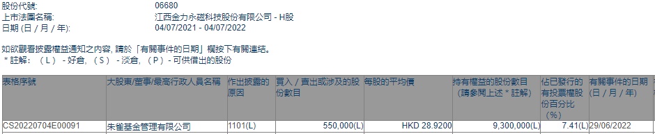智通财经APP获悉,香港联交所最新资料显示,6月29日,朱雀基金管理有限公司增持金力永磁(06680)55万股,每股作价22.92港元,总金额为1590.6万港元。增持后最新持股数目为930万股,最新持股比例为7.41%。