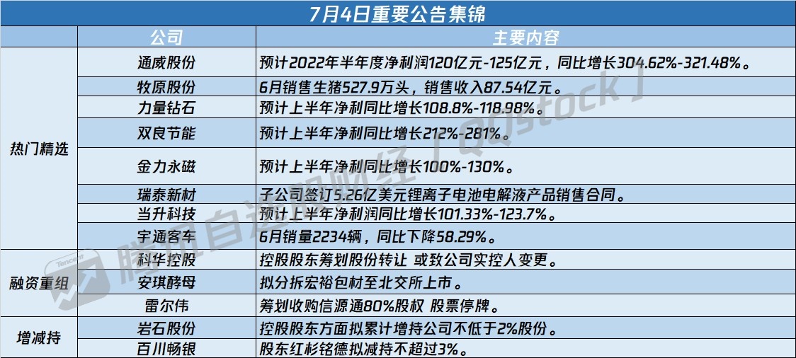 通威股份:预计2022年半年度净利润120亿元-125亿元,同比增长304.62%-321.48%。报告期内,高纯晶硅业务受益于下游需求的增长,叠加新产能顺利释放,实现量利大幅增长;电池片业务满产满销,出货量同比增长,大尺寸产品占比提升,盈利能力同比显著修复。