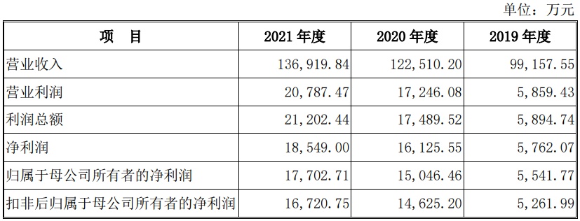 财务方面,于2019年、2020年和2021年,公司营业收入分别为9.92亿元、12.25亿元和13.69亿元。
