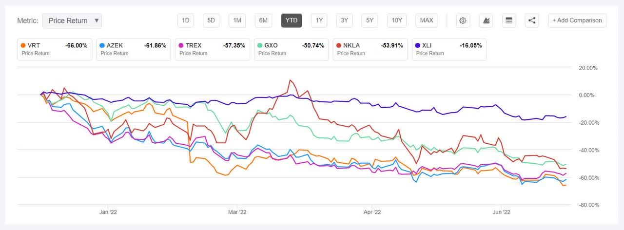 在市场超过20亿美元的工业股中,Vertiv(VRT.US)上半年的股价表现最差,跌幅高达67.12%。该股在2月公布了不及预期的第四季度业绩之后暴跌40%。这家为数据中心提供设备和服务的公司还指出,供应链阻碍将持续到2022年年底。然而,华尔街分析师对该股的平均评级为“买入”。