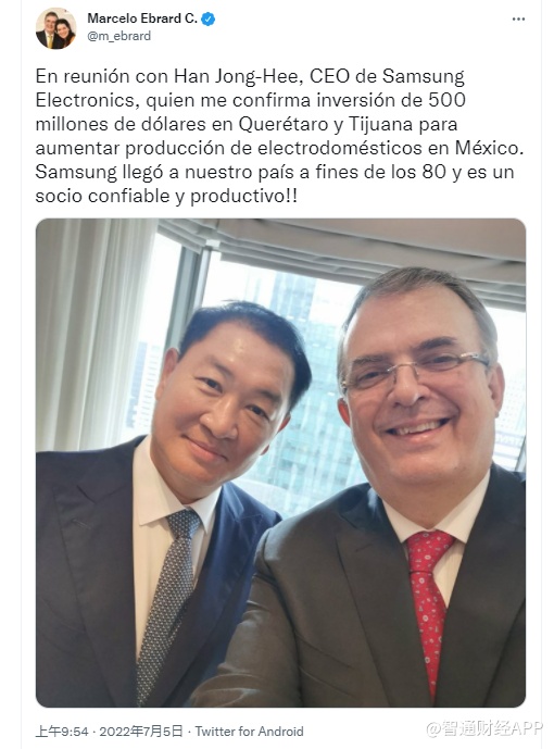 智通财经APP获悉,7月5日,墨西哥外交部长Marcelo Ebrard在推特上表示,三星电子计划向墨西哥投资5亿美元,以扩大墨西哥的家电生产。