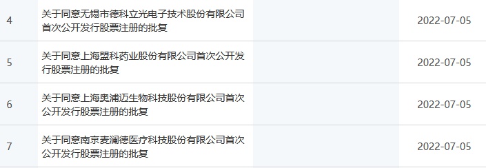 智通财经APP获悉,据证监会7月5日消息,证监会批复同意无锡市德科立光电子技术股份有限公司、上海盟科药业股份有限公司、上海奥浦迈生物科技股份有限公司、南京麦澜德医疗科技股份有限公司科创板首次公开发行股票注册。