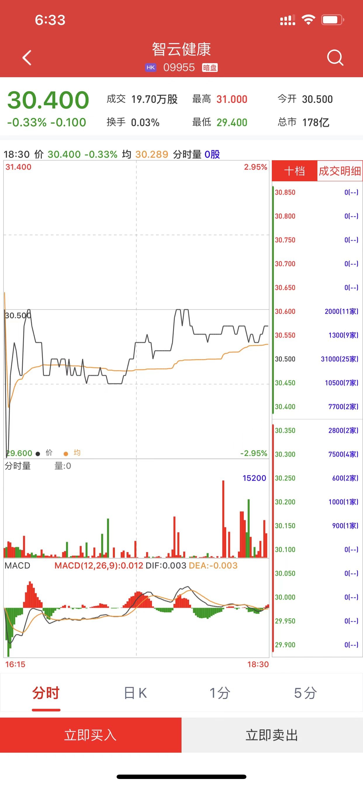 智通财经APP获悉,智云健康(09955)将于7月6日(星期三)在香港挂牌。截至收盘,利弗莫尔证券暗盘交易显示报价30.4港元,较招股价30.5港元跌0.33%。每手100股,不计手续费,每手亏10港元。