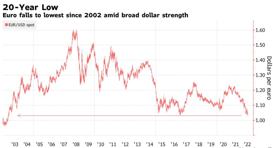 智通财经获悉,欧元兑美元汇率跌至20年低点,原因是欧洲央行可能放缓加息周期的预期,令市场更加确信欧元兑美元汇率将跌至平价。