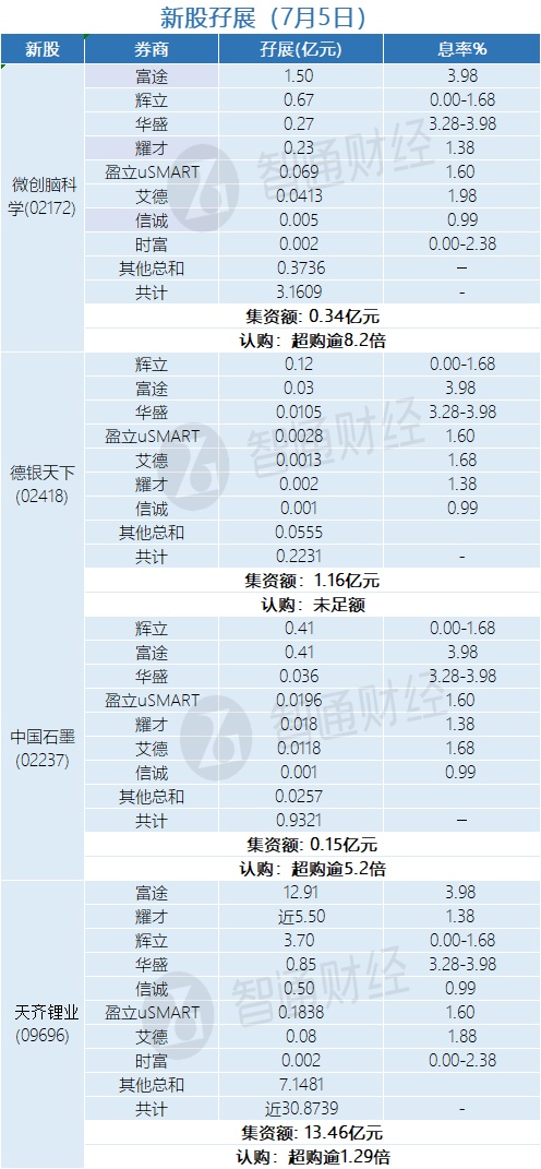 智通财经APP获悉,微创脑科学(02172)、德银天下(02418)、中国石墨(02237)、天齐锂业(09696)正在招股中。截至7月5日,富途、辉立、华盛、耀才证券等合计为微创脑科学、德银天下、中国石墨、天齐锂业分别借出孖展3.1609亿、0.2231亿、0.9321亿、近30.8739亿港元。微创脑科学超购逾8.2倍、中国石墨超购逾5.2倍、天齐锂业超购逾1.29倍,德银天下认购未足额。