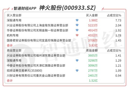 神火股份(000933.SZ):龙虎榜阵容豪华,机构席位买入4552万元,深股通买入1.65亿元,买二是知名游资苏州帮的席位买入5205万元,买三是知名游资苏南帮的席位买入4903万元,当日净买入2.4亿元,该股今日底部首板,突破箱体需放量。