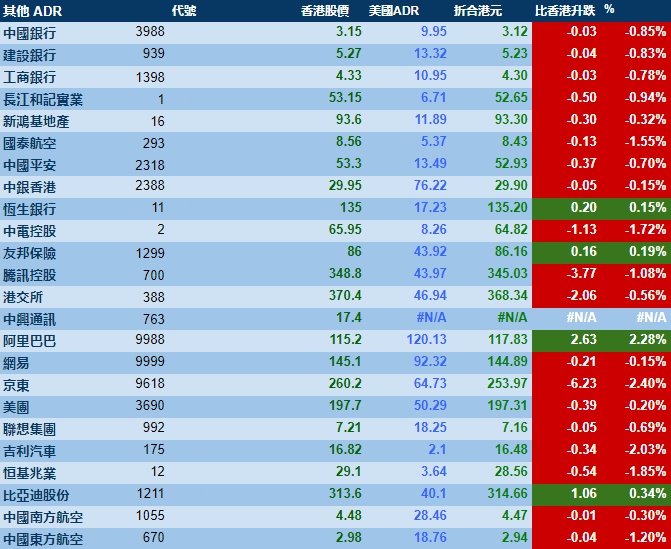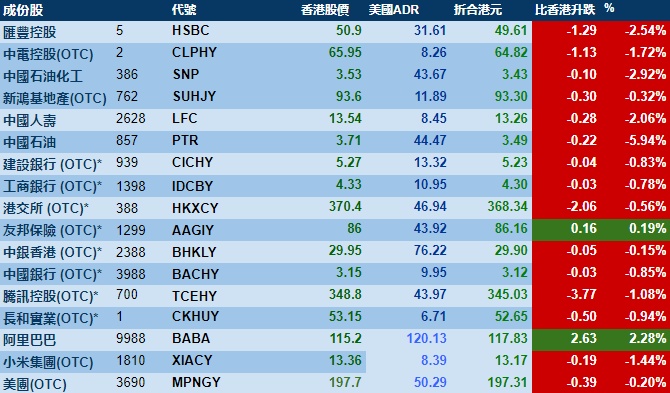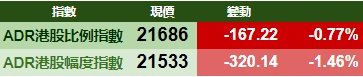 智通财经APP获悉,周二美股三大指数涨跌不一,港股ADR指数下跌,按比例计算,收报21686点,较香港收市跌167.22点或0.77%。