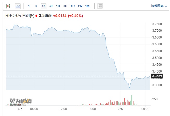 汽油跟随原油出现暴跌,当地时间7月5日,美国RBOB汽油期货结算价下跌9.7%,至每加仑3.329美元,创下16周来最大单日跌幅。