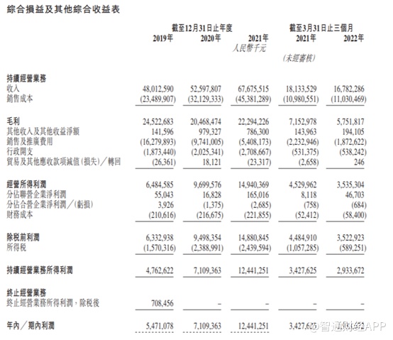 招股书显示,中国中免2019年至2021年,营业收入分别为480.12亿元、525.97亿元以及676.75亿元,年复合增长率18.72%。同期净利润分别为54.71亿元、71.09亿元以及124.41亿元,年复合增长率达到50.80%。截至2022年3月31日止三个月,公司的收入及利润分别为167.82亿元以及29.34亿元。