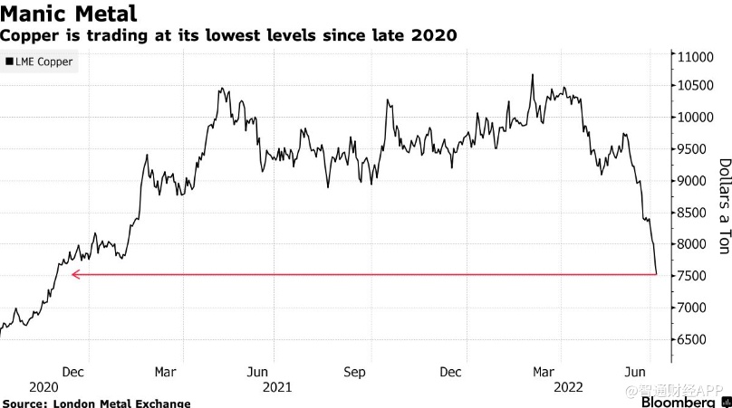 智通财经APP获悉,由于市场对于经济衰退的担忧加剧,工业金属价格再度遭重挫,铜价跌破每吨 7500 美元,刷新2020年年底以来的最低水平。