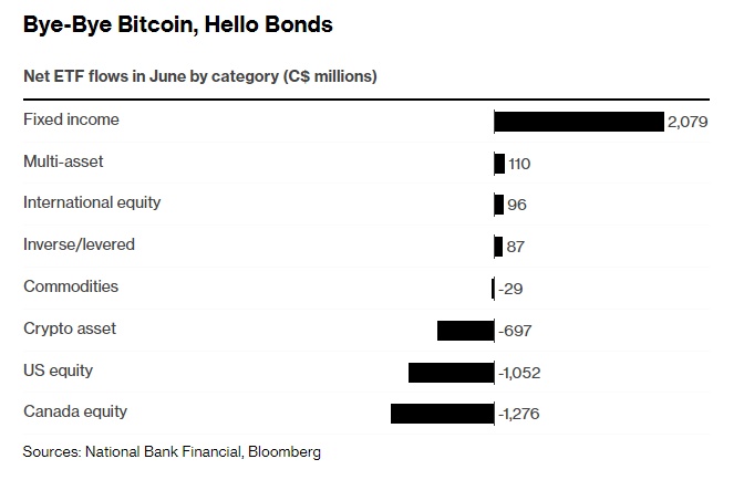 股票ETF资金外流主要来自于抛售加拿大和美国指数基金的投资者。6月份,所有在加拿大上市的ETF的资金流出总额为6.82亿加元,为三年来首次出现月度下降。