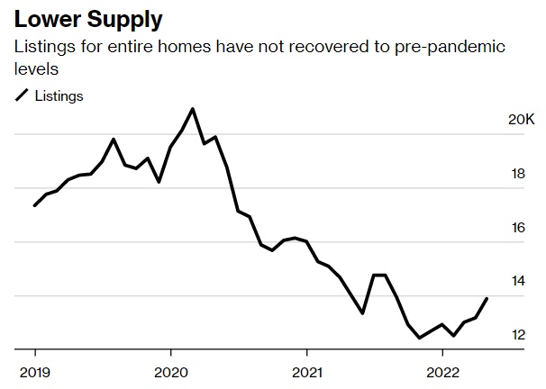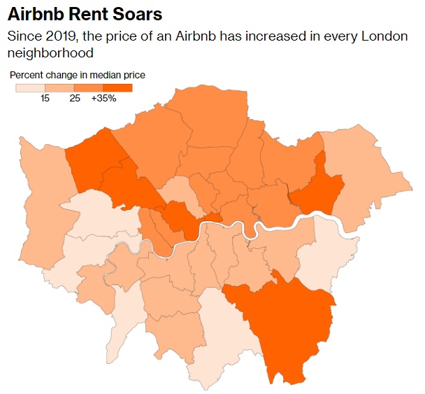 数据显示,5月份爱彼迎伦敦地区的14,000套房产数量比2020年的峰值低了约三分之一。