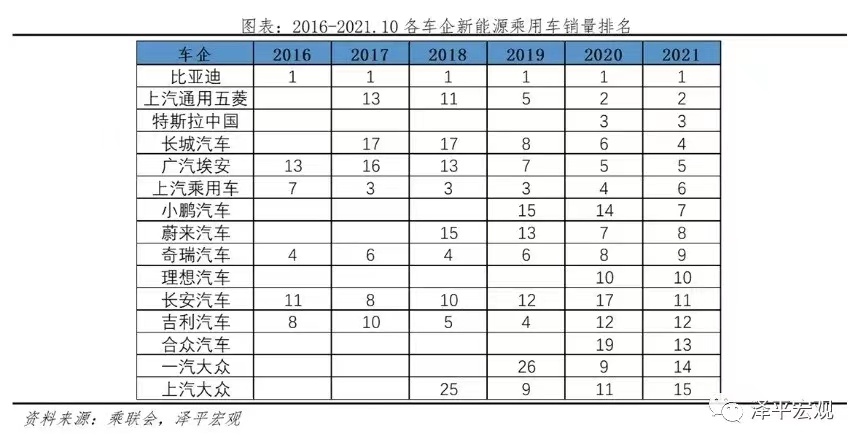 2016年,中国新能源汽车市场集中度指标CR1、CR3、CR5、CR10分别为31.6%、57.3%、70.1%和95.6%,到2021年分别降至19.5%、44.5%、53.4%和70.1%,市场的集中度出现明显下降,众多新生品牌涌入市场抢占市场份额。