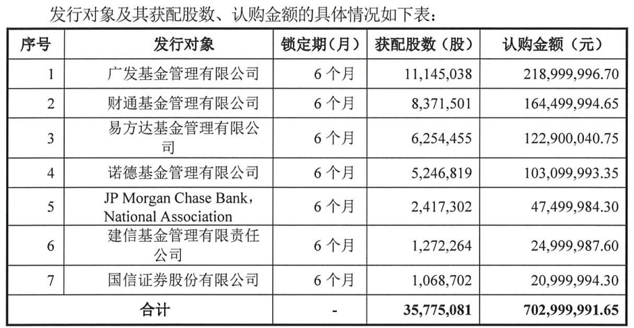 该次非公开发行股票的发行价格为19.65元/股,广发基金管理有限公司获配2.19亿元,财通基金管理有限公司获配1.64亿元,易方达基金管理有限公司获配1.23亿元,诺德基金管理有限公司获配1.03亿元。
