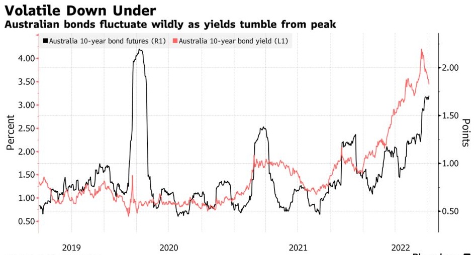 澳大利亚国债周三开盘后跟随美国国债的走势上升。澳大利亚十年期国债收益率下跌多达13个基点,至3.42%,而十年期国债期货的实际波动率攀升至2020年3月以来的最高水平。