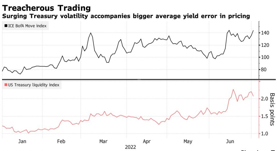 周二,衡量美国国债30日隐含波动率的ICE美国银行MOVE指数升至疫情初期以来的最高水平。另一项彭博指数显示,债市流动性也处于自那以来的最差水平,加剧了这种价格波动。一般情况下,指数越高,债券交易的公允价值就越低。