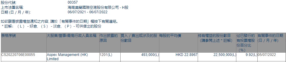 智通财经APP获悉,香港联交所最新资料显示,7月5日,Aspex Management (HK) Limited减持美兰空港(00357)49.3万股,每股作价22.8967港元,总金额约为1128.81万港元。减持后最新持股数目为2250万股,最新持股比例为9.92%。