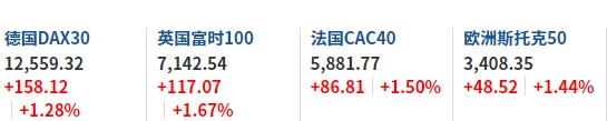 2. 截至发稿,德国DAX指数涨1.28%,英国富时100指数涨1.67%,法国CAC40指数涨1.50%,欧洲斯托克50指数涨1.44%。