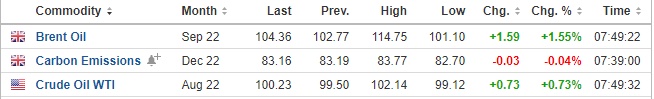 3. 截至发稿,WTI原油涨0.73%,报100.23美元/桶。布伦特原油涨1.55%,报104.36美元/桶。