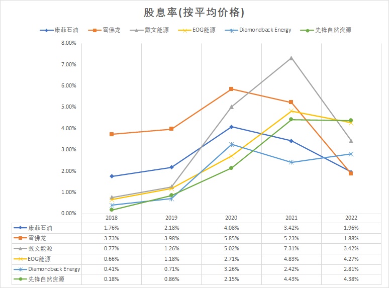 由图6可见,从2018年起,戴文能源、EOG能源和先锋自然资源的股息率基本逐年上升,其中涨幅最大的是戴文能源,而康菲石油、雪佛龙及Diamondback Energy的股息率都在2021年有所下滑。