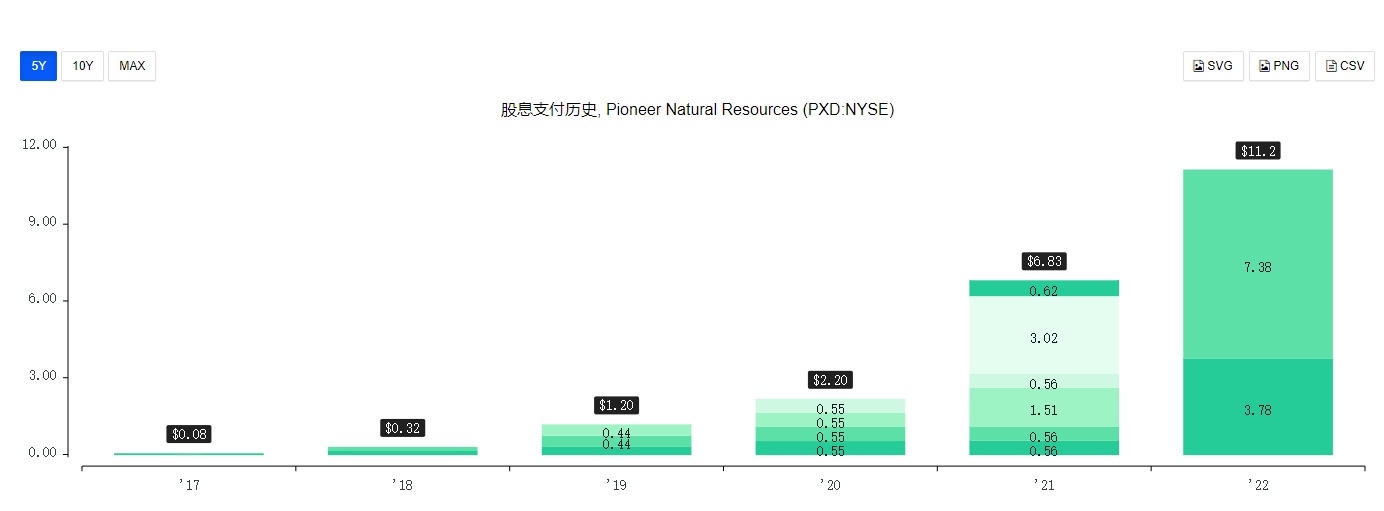 值得一提的是,先锋自然资源在2022年2月的股息派发直接从0.62美元(2021年11月)涨至3.78美元,直至2022年5月最近一次派息,该公司派发7.38美元股息。据了解,该公司有能力从已投资的项目中获得可持续的超额回报,因为该公司仅在二叠纪盆地运营,而二叠纪盆地是美国最便宜的原油来源,因此,它的固定成本分摊地更薄,支持其高于平均水平的单位收入。