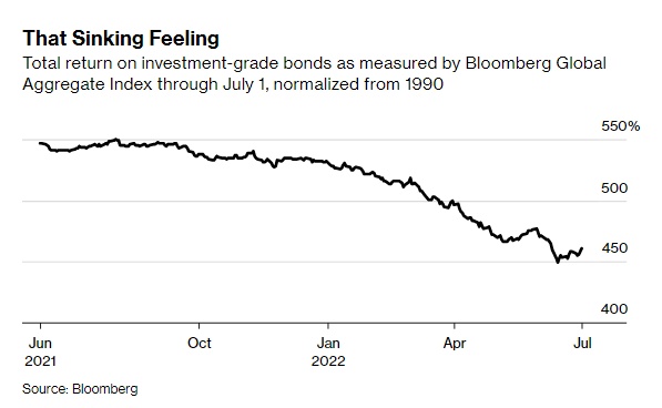 然后在2022年初,一系列因素进一步加剧了通胀担忧,包括俄乌冲突、美国和欧盟实施的制裁,以及亚洲因疫情引发的新一轮停工。今年3月,美联储启动了一系列大幅加息。截至6月14日,衡量企业和政府债券总回报率的彭博全球综合指数已较峰值下跌19.7%。