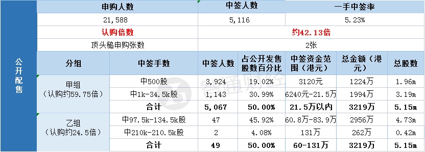 其中,公开配售申购人数21588人,一手中签率5.23%,认购倍数约42.13倍。