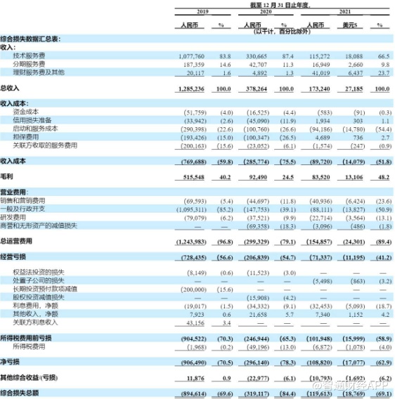 2021年,公司的技术服务费和分期服务费双双大幅下降,技术服务费从2020年年底的3.307亿元下降至1.153亿元,分期服务费从2020年年底的4,270万元下降至1,690万元,理财服务费则上涨738.5%至4,100万元,主要是由于业务转型带来的保险经纪业务的扩张。