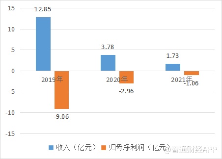 2019-2021年间,营收与亏损双双收窄,收入分别为12.85亿元、3.78亿元和1.73亿元,其中2020年同比下降70.58%。归母净亏损分别为9.06亿元、2.96亿元和1.09亿元。