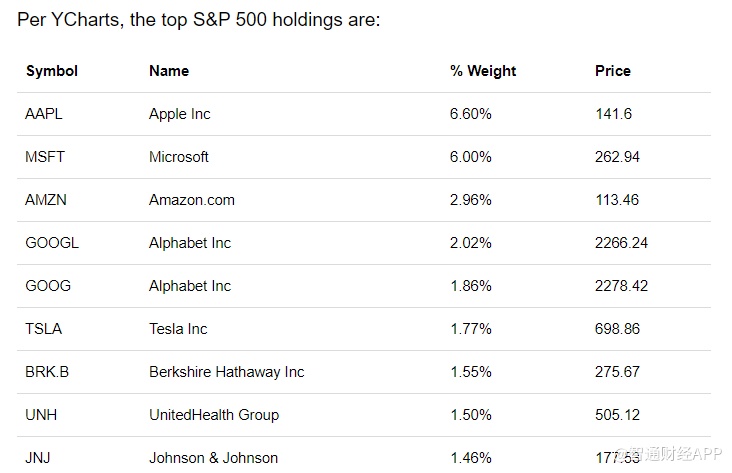 根据 YCharts,标普 500 指数的主要成分股包括: