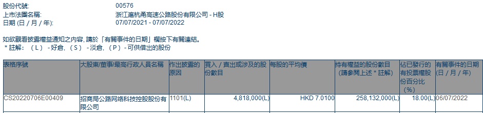 智通财经APP获悉,香港联交所最新资料显示,7月6日,招商公路增持浙江沪杭甬(00576)481.8万股,每股作价7.01港元,总金额约为3377.42万港元。增持后其持股数目约为2.58亿股,最新持股比例为18%。